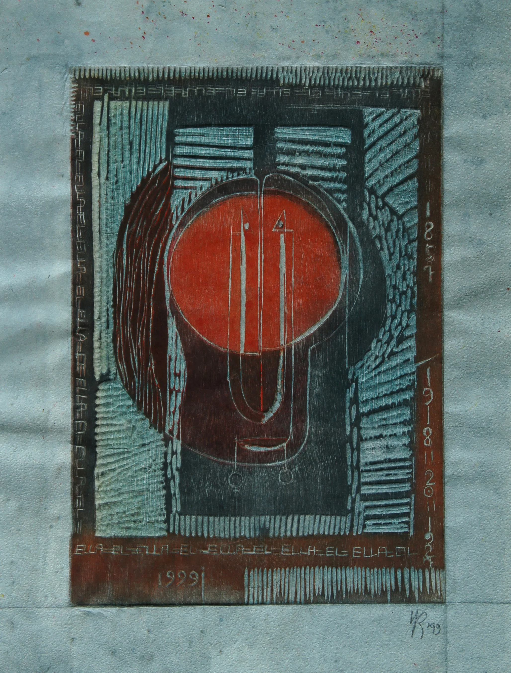 In addition to relief printing*, YR has also intaglio-inked the plate to highlight the grooves defining the face.