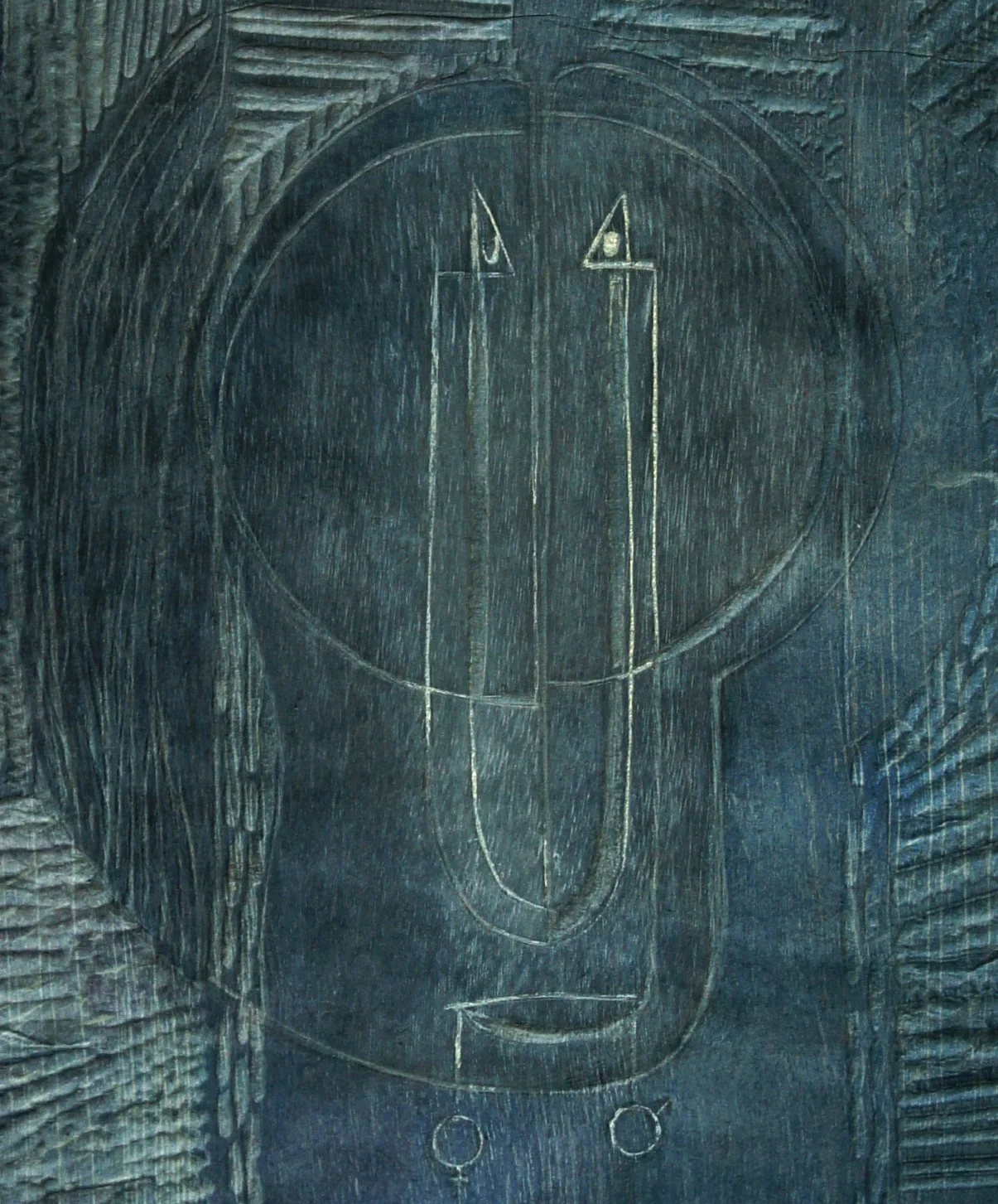 As if an initial attempt to reconcile the two genders, YR has merged the masculine and feminine into a single abstract face, a cascade of hair on one side offsetting the baldness of the other. Small beady eyes stare out from the base of a phallic-shaped nose, which extends down to a thinly drawn mouth. The symbols of femininity and masculinity seem to hang, like weights, from the pursed lips.